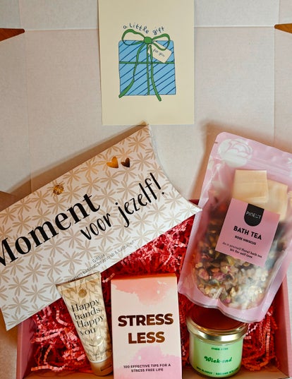 Bad thee, handcrème, kaartjes met tips om minder stress te hebben, een cadeaudoos met scrub, bruisbal en badzout en een geurkaarsje